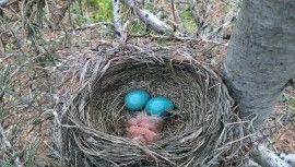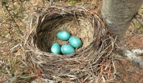 First I saw two eggs so I positioned my camera phone over the nest and was surprised to see four robin eggs. Apparently this is the norm for robins.